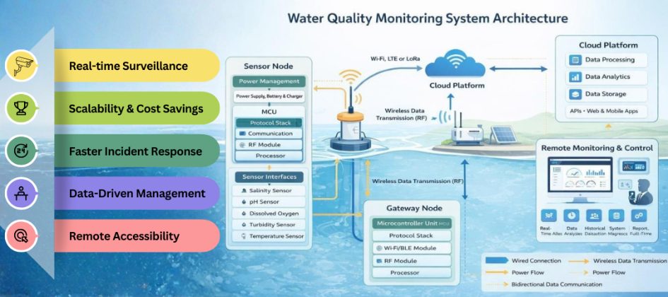 Water is the fundamental human need and is most essential for life as a driver of industrial applications, public health, environmental sustainability, and agriculture. Rapid industrialization, increasing population and subsequent urbanization, global warming, pollution, and climatic stress constantly threaten the quality of water bodies. Depleting quality can be hazardous in nature, as it leads to food poisoning, respiratory issues, skin diseases, diarrhea, and many other health-related problems apart from endangering aquatic ecosystems and life. Conventional methods of assessing water quality without using devices engineered by electronics manufacturing services require hours of manual effort, laboratory testing, and result analysis. Therefore, this does not support real time decision-making and quick responses to water body contamination.